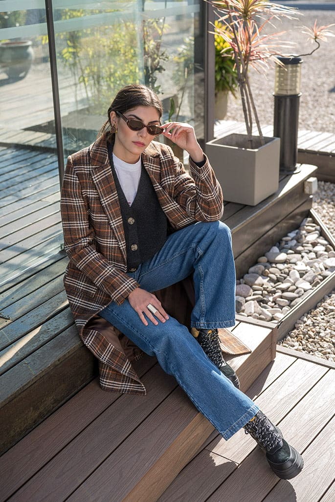 Tapado a cuadros y cรกrdigan tejido (Portsaid), remera de algodรณn y jean ancho (Melocotรณn), anteojos de sol y aros vintage (Chantal Vintage), maxianillo (Mรกs Negro) y borceguรญes de cuero ecolรณgico y gamuza (Viamo).).