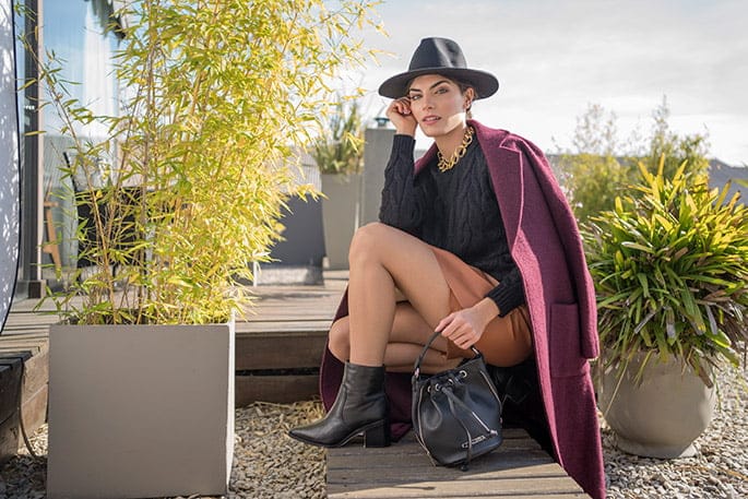 Tapado (Giesso), suรฉter tejido y falda de cuero ecolรณgico (Casa Rincรณn), botinetas (Viamo), sombrero de paรฑo (La Juanita Sombreros), collar (Chantal Vintage) y minibag (Citadina).