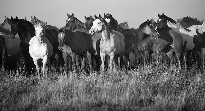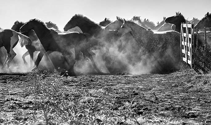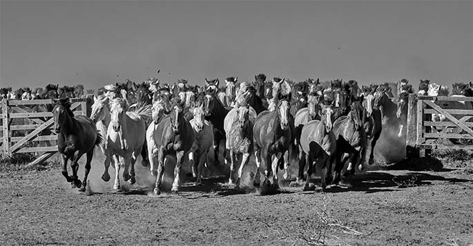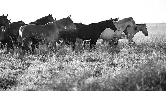 Los caballos al galope en pleno campo al amanecer, en el momento justo en que el sol se asoma y su luz es apenas un filo de claridad que recorta las siluetas en movimiento contra el horizonte, es quizรกs uno de los espectรกculos mรกs impactantes que puede ofrecer la pampa infinita. A la maravilla del lugar y la hora se le agrega la sensaciรณn de libertad que los equinos transmiten con su cabalgar por la llanura y al desnudo, sin monturas, riendas ni cabezada.