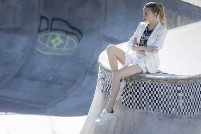 Blazer (Ayres), remera de algodรณn con estampa (Rock & Other Stories), bermudas (Furzai), zapatillas de cuer`o (Justa Osadรญa), collar con dije (Lolas Complementos) y collar con cadenas (Vitamina).