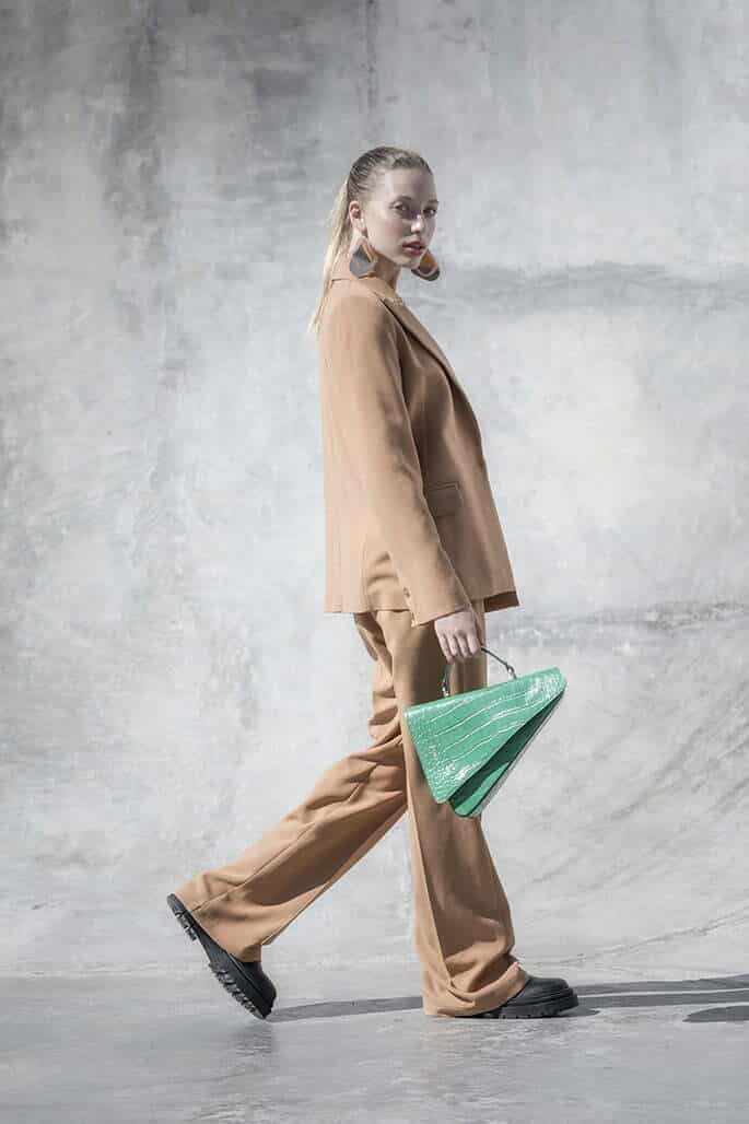 Blazer y pantalรณn oversize (Delucca), aros geomรฉtricos (Uniรณn Joyas), cartera de cuero de croco (Sentรจz) y botas de cuero (Oggi).