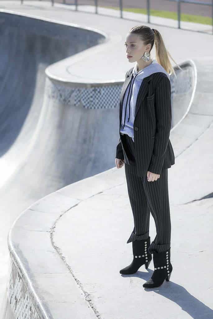 Blazer y pantalรณn con raya diplomรกtica (Furzai), buzo de algodรณn (Vitamina), botinetas de gamuza con tachas (Uma) y aro geomรฉtrico (รnima).