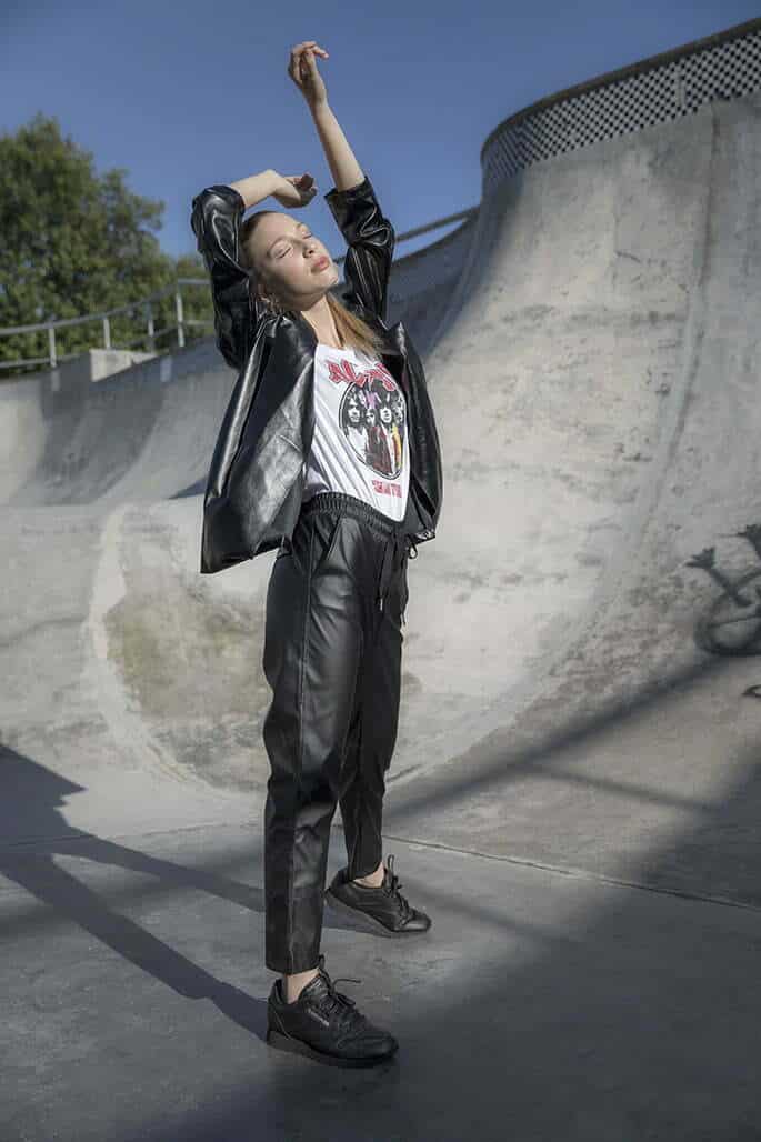 Blazer de cuero ecolรณgico (Sweet), remera de algodรณn con estampa y babucha de cuero ecolรณgico (Rock & Other Stories), zapatillas de cuero (Reebok) y aros metรกlicos (Lolas Complementos).