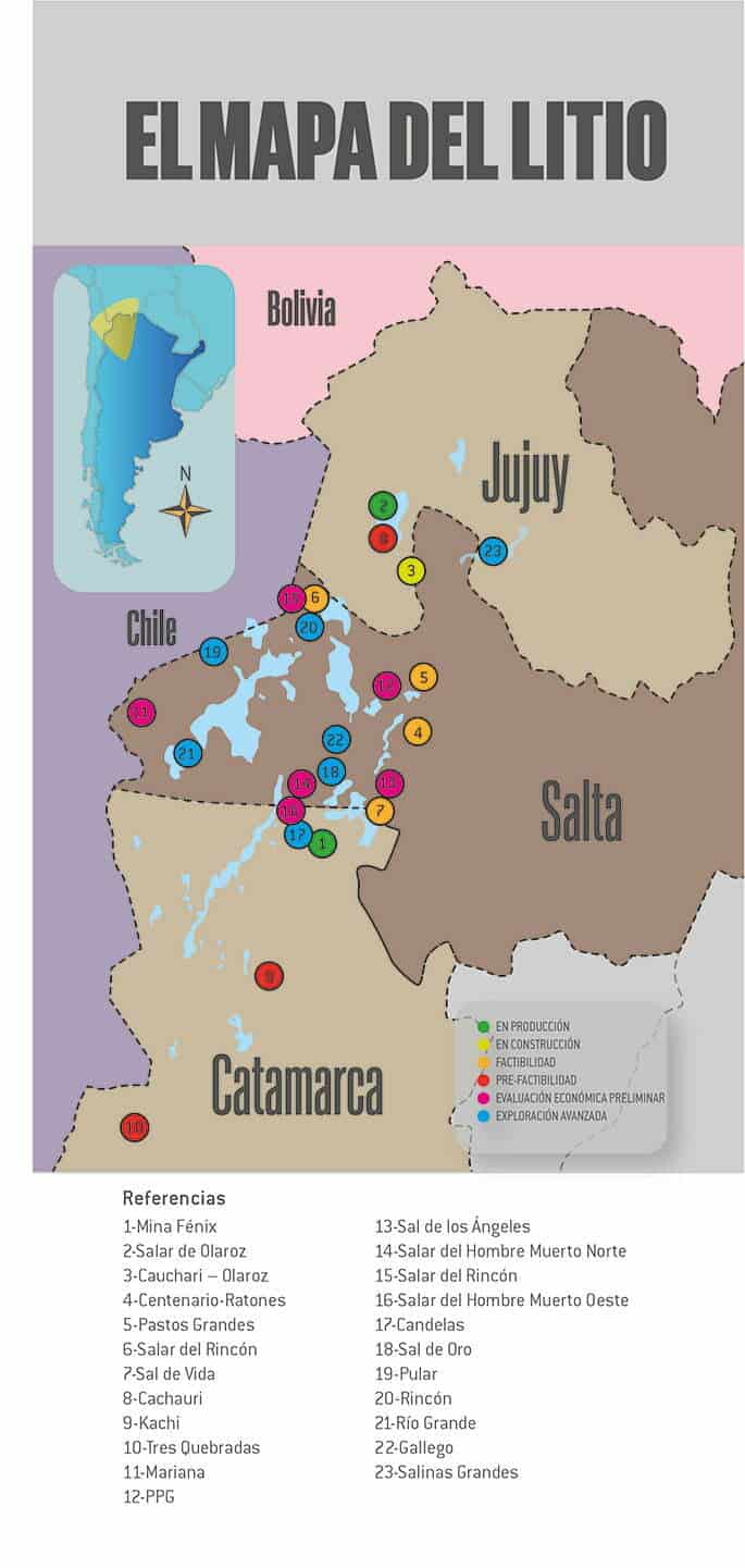 Las reservas nacionales se concentran en tres provincias: Catamarca (salar de Hombre Muerto y salar de Antofalla), Salta (salar del Rincón) y Jujuy (salar de Olaroz y salar de Cauchari). En ese territorio se encuentra alrededor del 12 por ciento de las reservas mundiales.