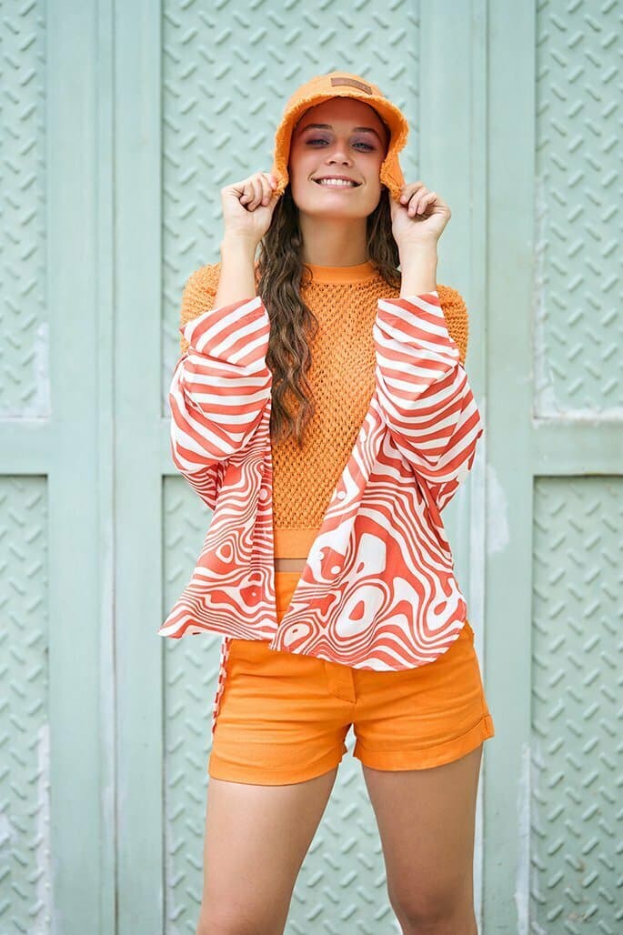 Camisa estampada y gorro de gabardina (Ampi Vera), remera tejida (Las Pepas) y short deย lino (Naรญma).