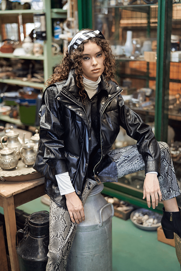 Chaleco puffer (Desiderata), camisaco croco y babucha reptil (Mirta Armesto), polera de rib gamuzado (Portsaid), botas de cuero (Oggi) y pañuelo de seda (Perramus).