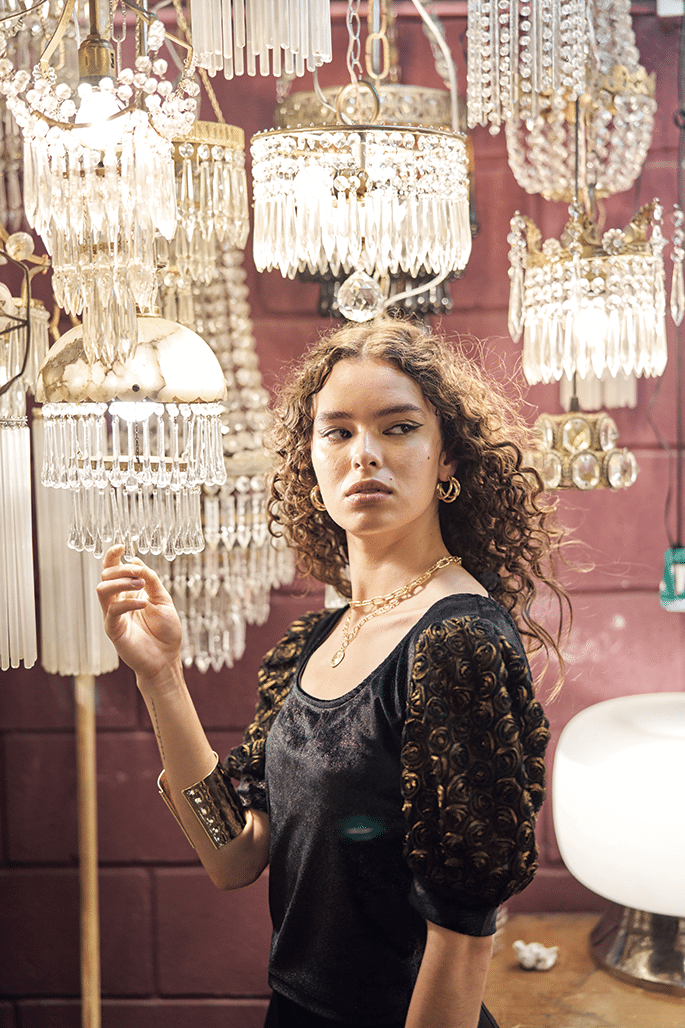 Top de chifón con mangas globo y flores bordadas (Las Pepas), y brazalete dorado y collares (Cuatro Musas).