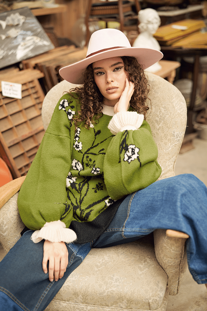 Sombrero de fieltro (Compañía de Sombreros), suéter de lana oversize con estampa y jean ancho con recortes (Las Pepas).