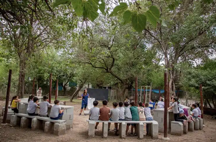 El sol cae perpendicular sobre los techos de chapa y la temperatura sube sin piedad a esta hora del mediodรญa. Afuera, los รกrboles ofrecen un techo fresco y en constante movimiento, como los chicos que juegan en el patio, como los chicos que siguen de cerca la clase de inglรฉs en el โaula al aire libreโ, un espacio pensado especialmente para estos dรญas de calor y para los de mucho frรญo, pero con solcito.