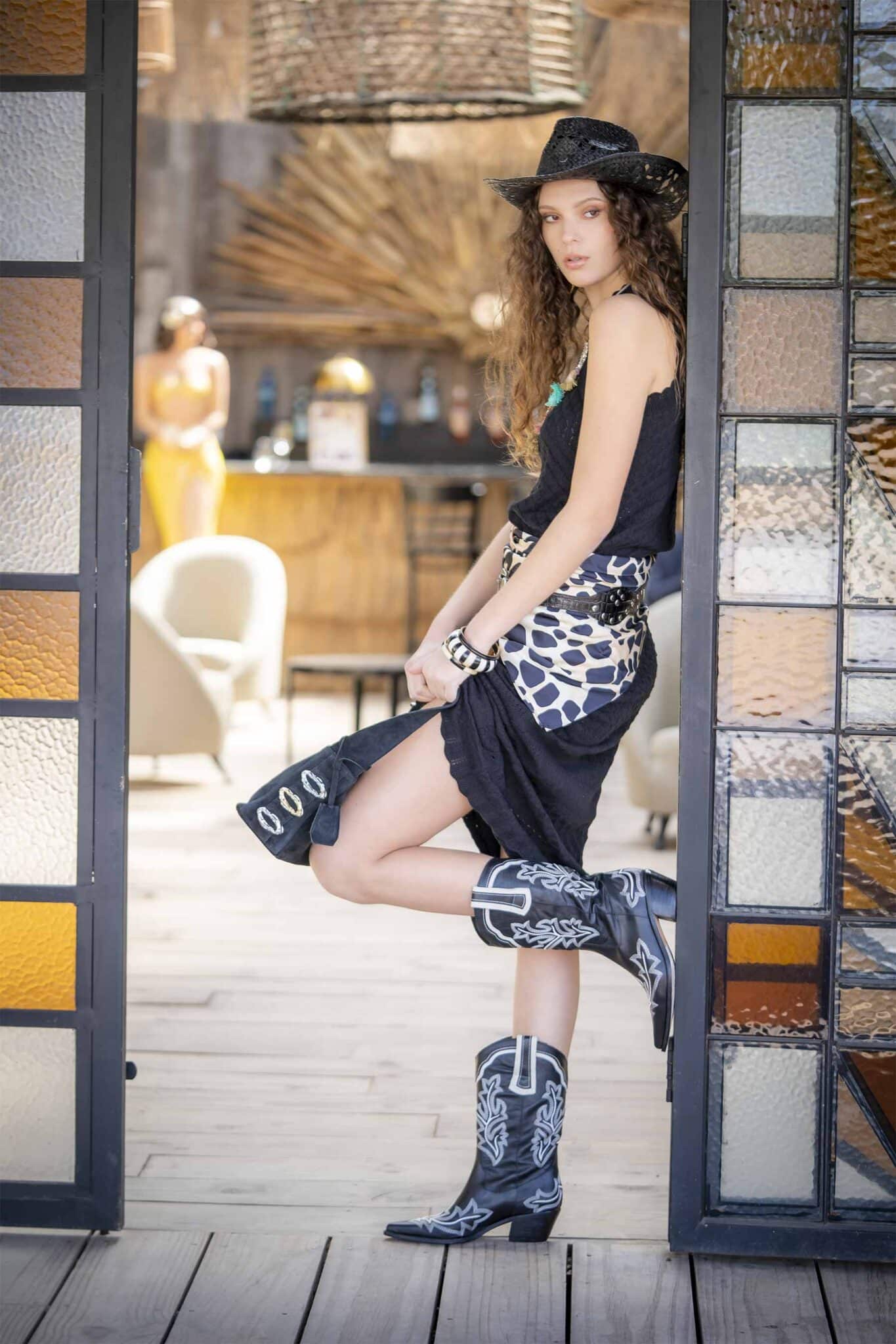 Conjunto de top y falda tejida (Armesto), paรฑuelo animal print (Clara), sombrero de sรญmil rafia, cinturรณn con tachas, cartera de gamuza con apliques y botas texanas (Tina Allo), y collar con flecos y pulseras esclavas en dorado y negro (Varโs).