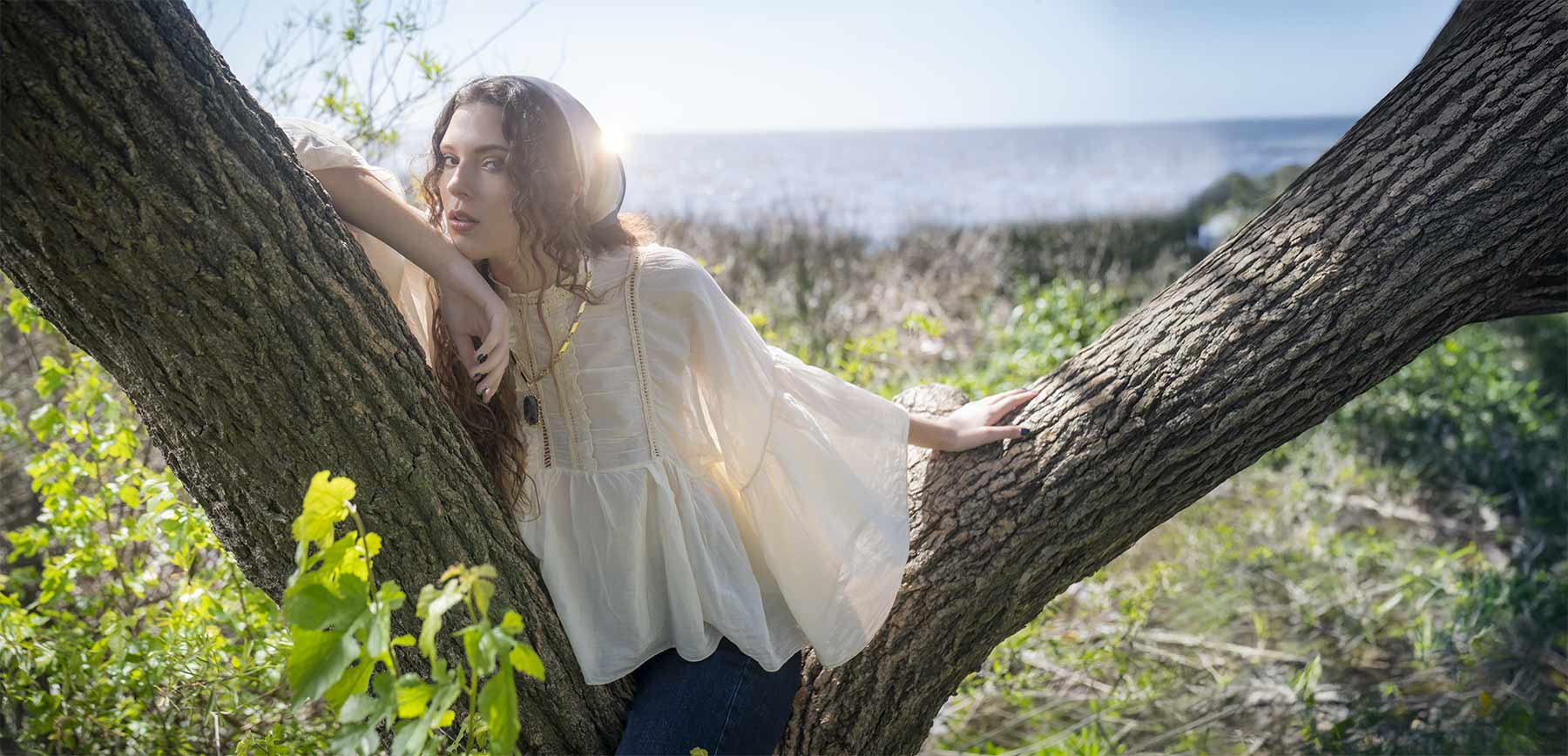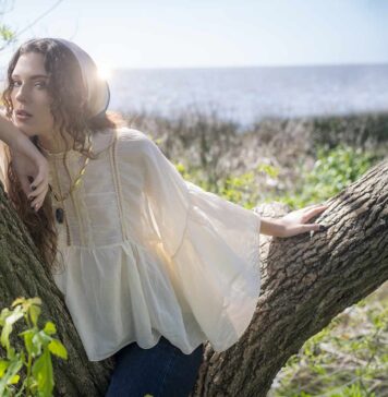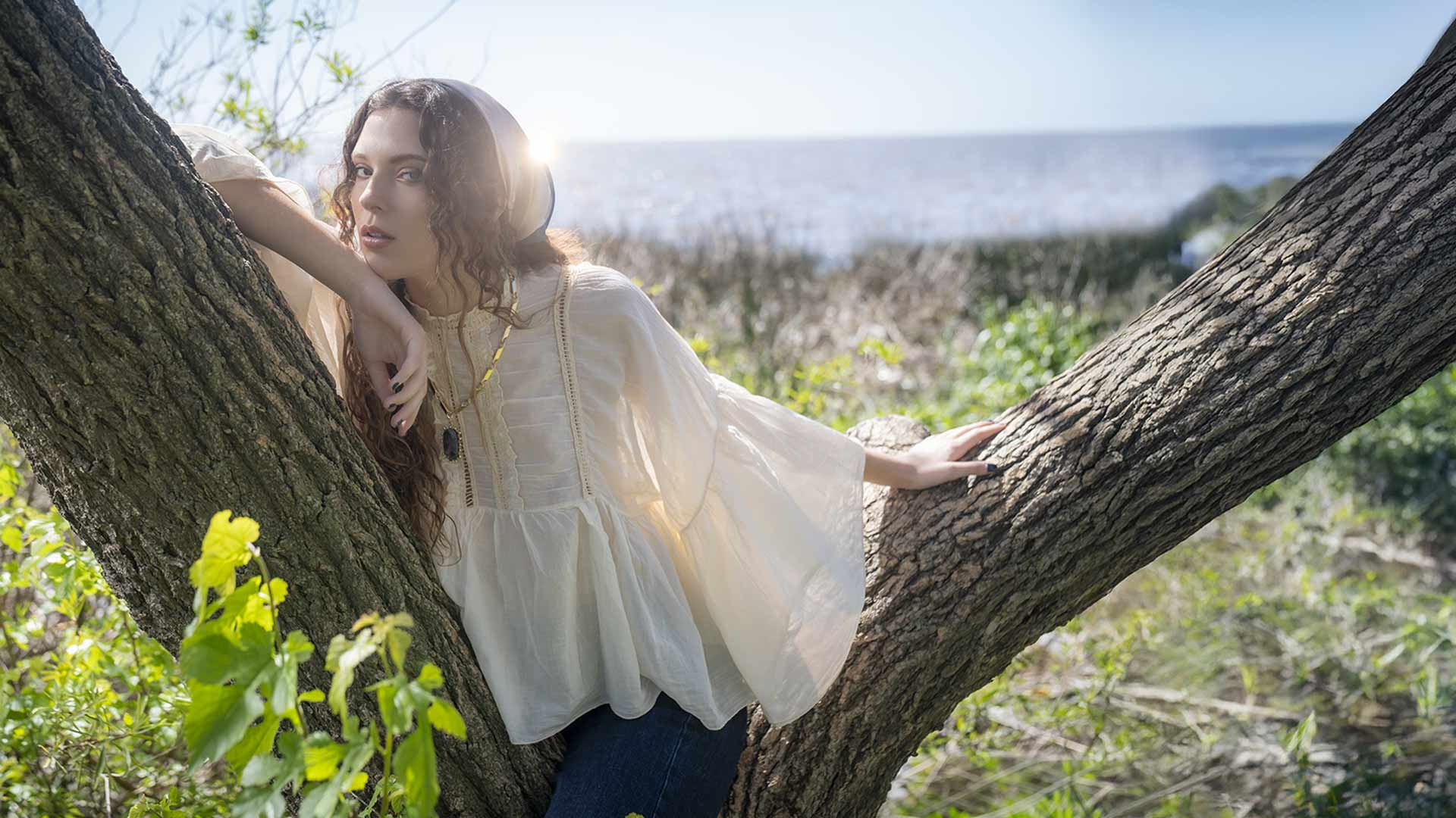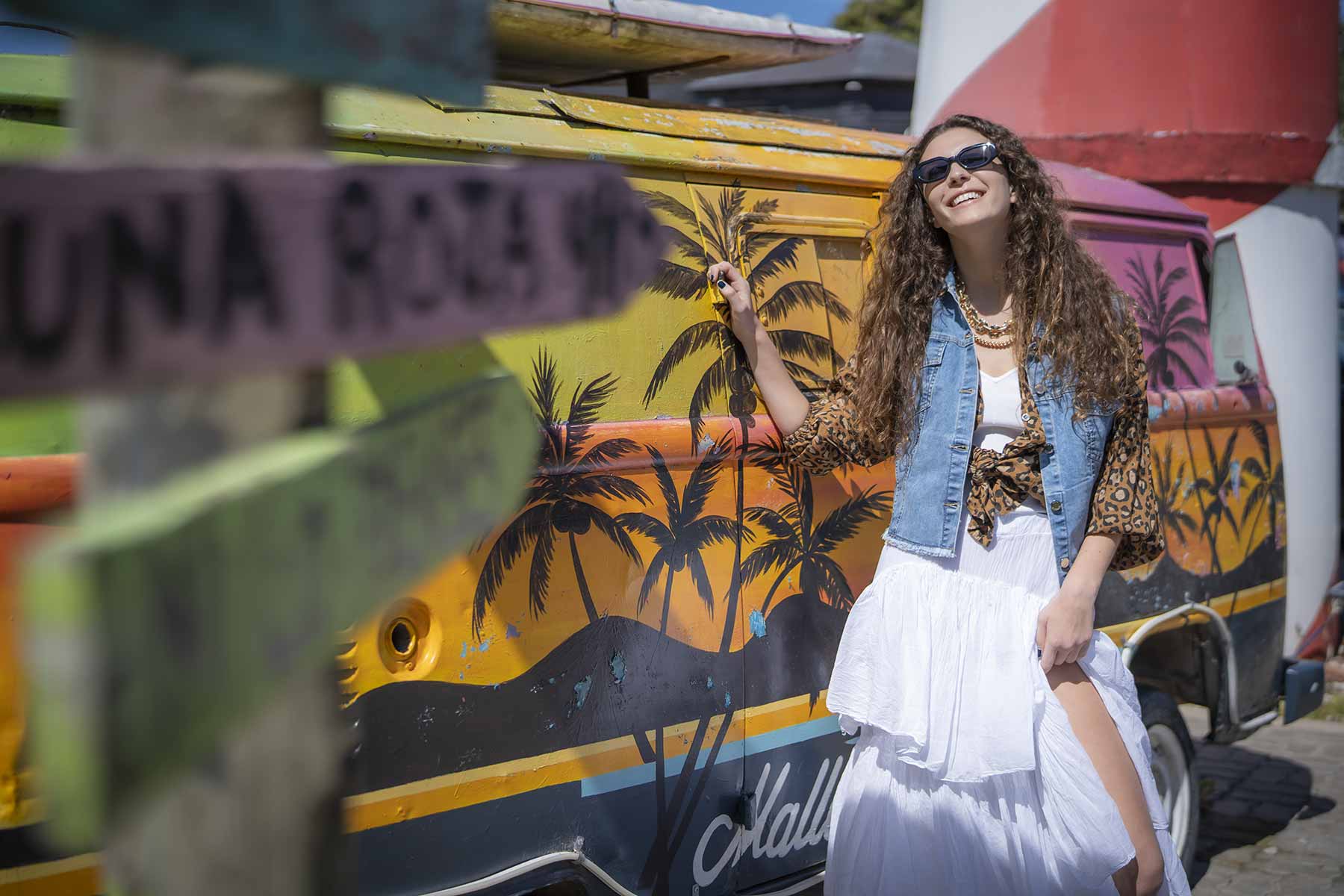 Top de gasa irregular con volados, aros, collar con borlas y paรฑuelo atado a la muรฑeca (Varโs), short de jean de tiro alto (Las Pepas), cinturรณn de cuero, anteojos de carey y cartera de gamuza (Tina Allo), y botas de lluvia Hunter (Perramus).