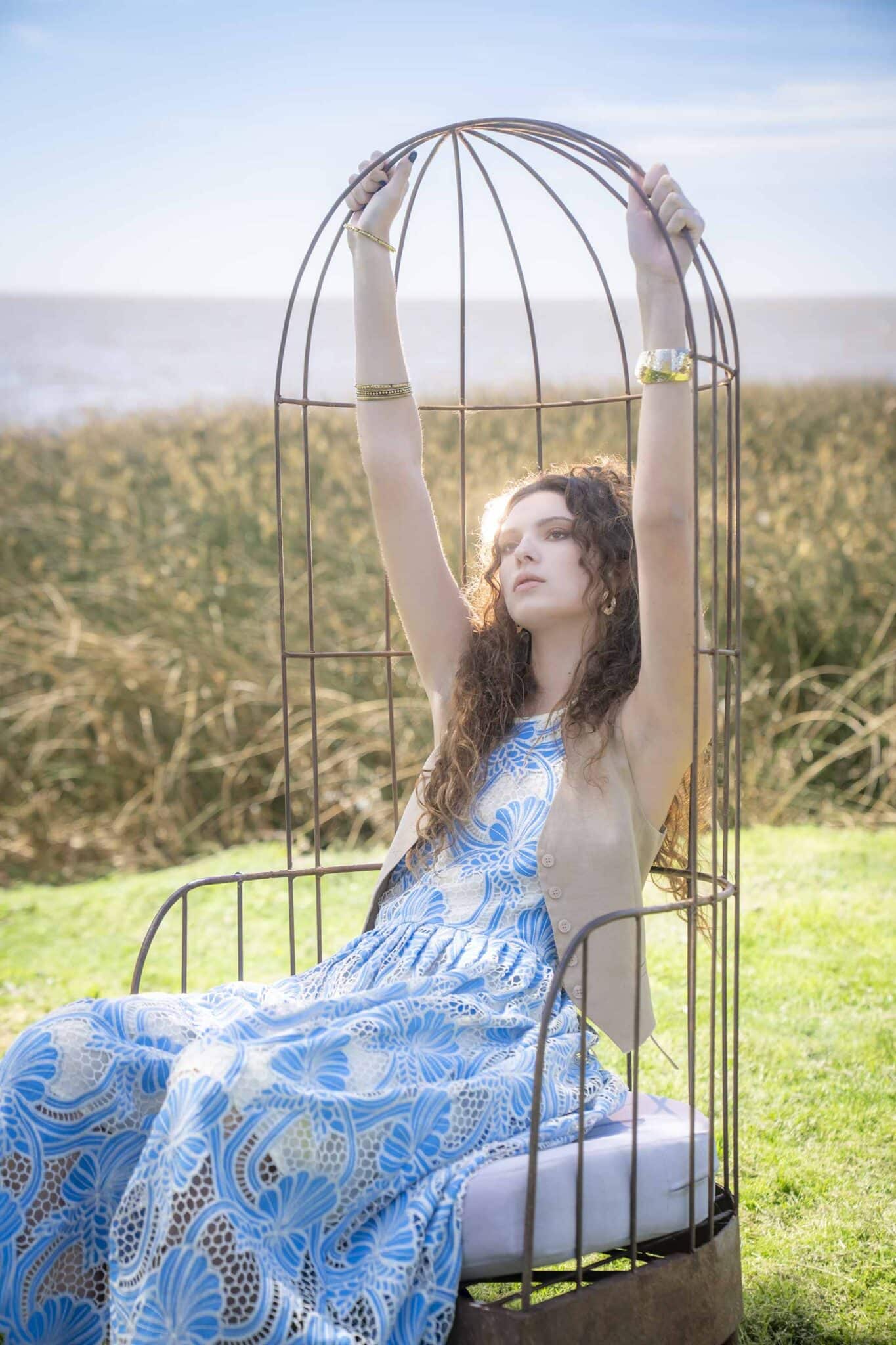 Vestido con cuello halter (Clara), chaleco de lino (Las Pepas), pulsera esclava ancha (Tina Allo) y pulseras finitas y aros largos (Varโs).
