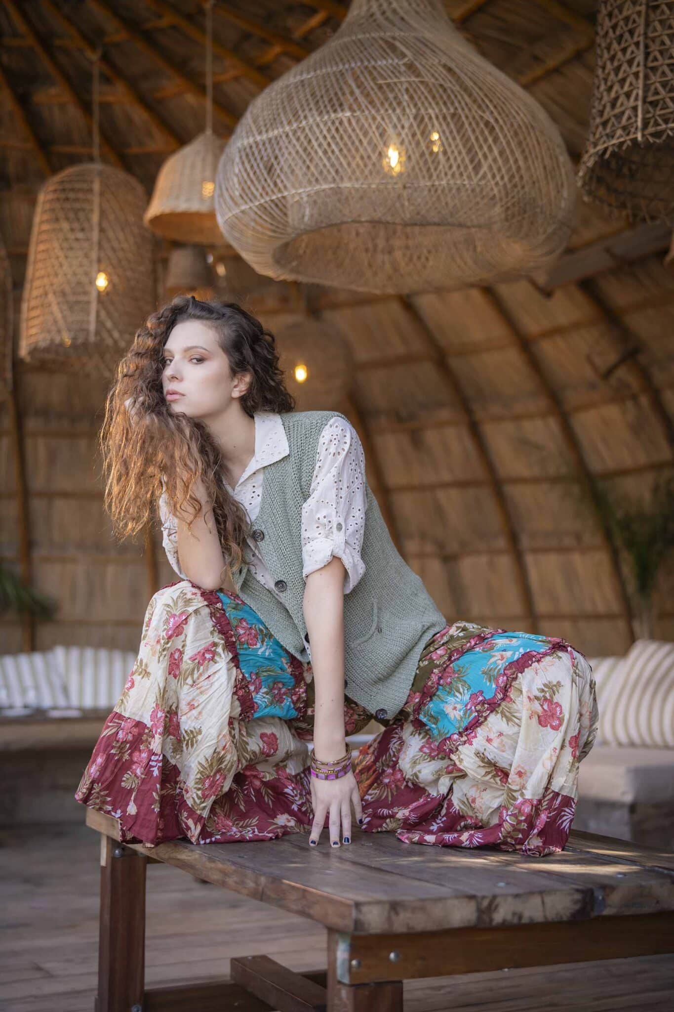 Blusa de broderie, pantalรณn estampado con volados y mix de pulseras esclavas (Varโs), y chaleco tejido (Perramus).