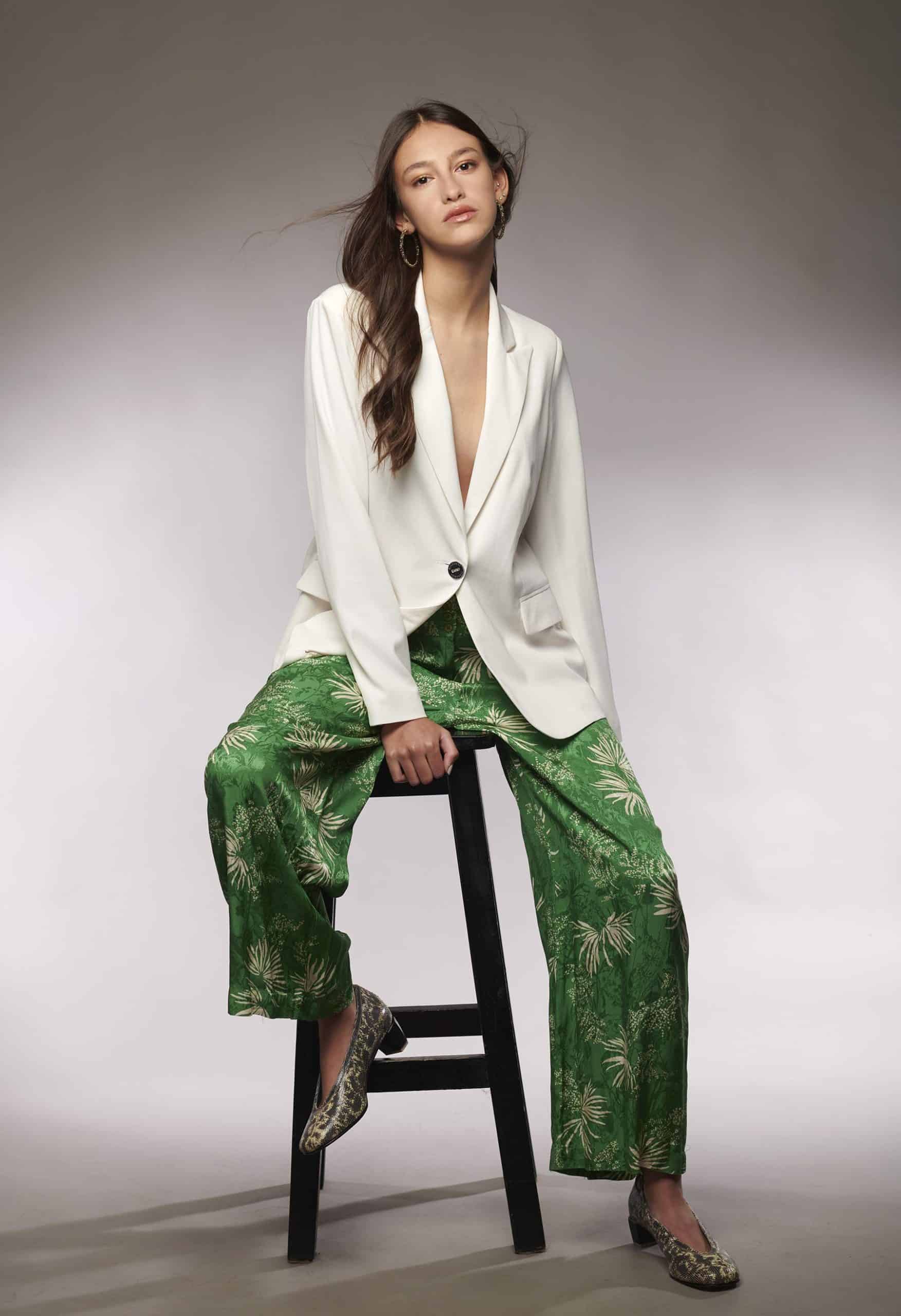 Blazer de lino (Perramus), aros argollas (Isadora), pantalón pinzado con estampado y zapatos de cuero croco (Mishka). (Foto: Alejandra López / Estilismo: María Guerrero).