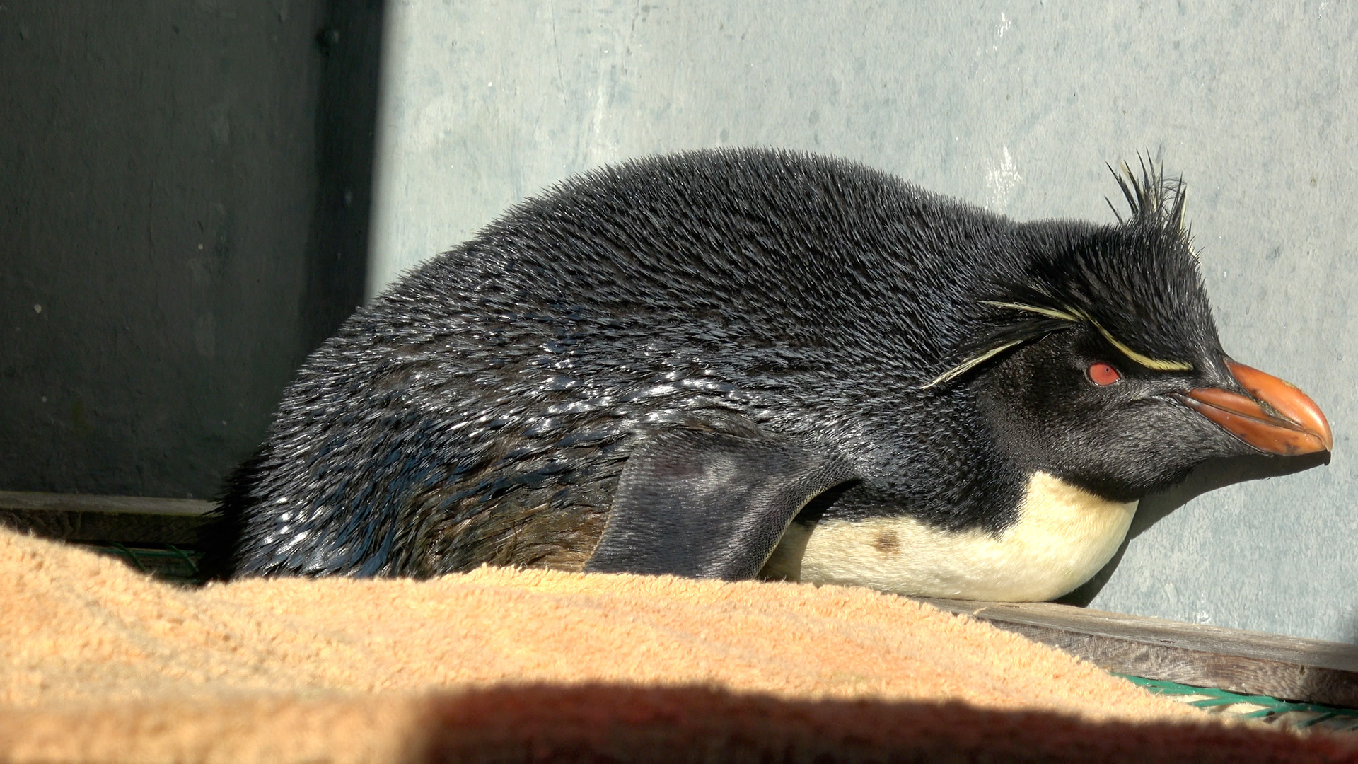 Por otro lado, el caso más singular fue el de un pingüino saltarín adulto ingresado desde Pinamar que llegó empetrolado. El petróleo destruye la microestructura de las plumas que, en condiciones normales, actúan como una barrera impermeable al agua y al frío. Al impregnarse con hidrocarburos, esa barrera colapsa: el agua penetra hasta la piel, la temperatura corporal cae y el animal entra en hipotermia. Para revertir ese daño, el ejemplar debió atravesar un lavado especializado que permite remover el petróleo sin dañar aún más las plumas. Una vez limpio, el animal debe reordenar cada pluma con el pico – un comportamiento llamado acicalamiento- hasta recuperar la capa impermeable.