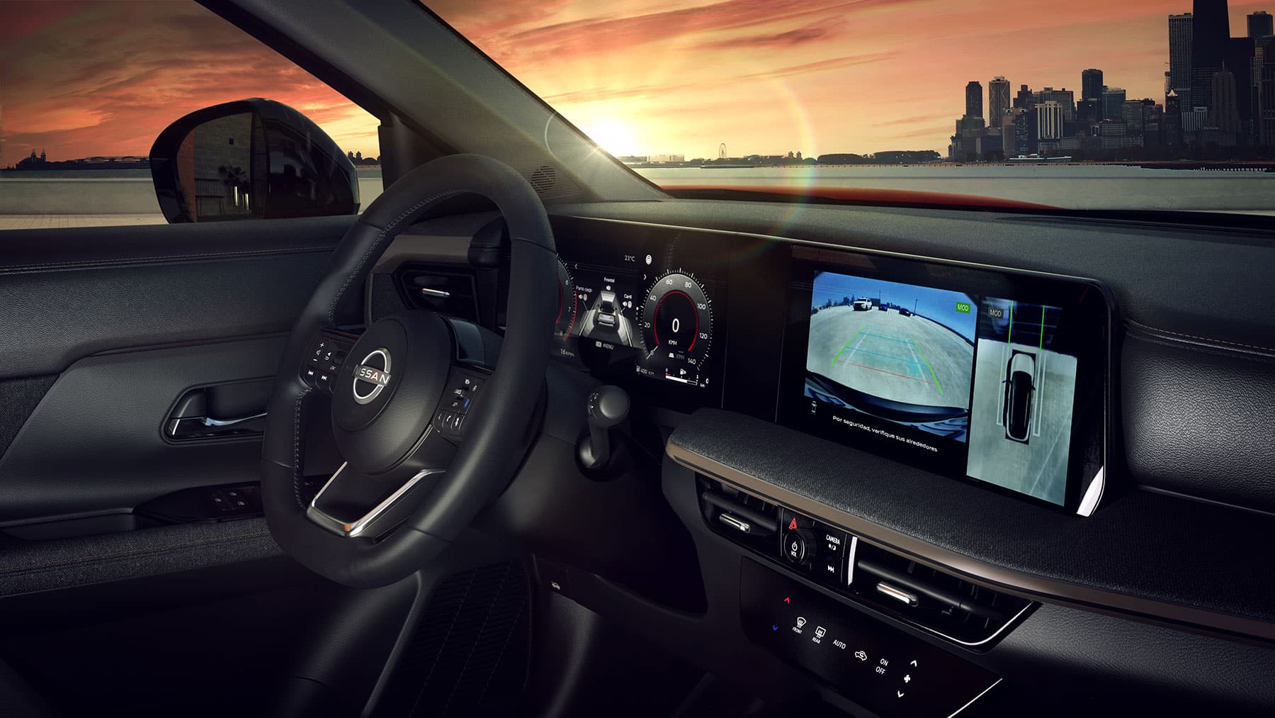 En la decoración se advierten ciertos guiños hacia el nuevo X-Trail, incluso en el volante y varios comandos del instrumental. Sin embargo, el que más llama la atención es el que se ocupa de seleccionar la posición de la caja de velocidades: en lugar de una palanca o un comando radial, hay cuatro teclas. También tiene levas en el volante.