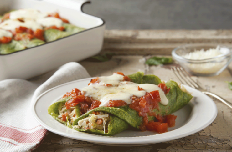 Licuar la espinaca con los huevos, la leche y la harina sin dejar grumos. Fundir la manteca e incorporar a la preparaciรณn. Dejar descansar, mรญnimo por 30 minutos en heladera. Cocinar los panqueques en sartรฉn con manteca. Reservar.