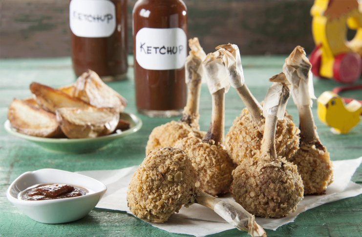 Servir las patitas de pollo con el kétchup, y acompañar con las papas.