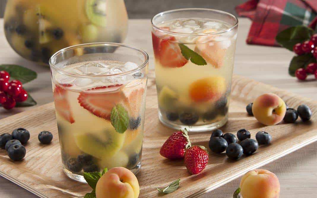 Colocar la fruta dentro de una jarra de 2 litros y verter el vino bien frío.