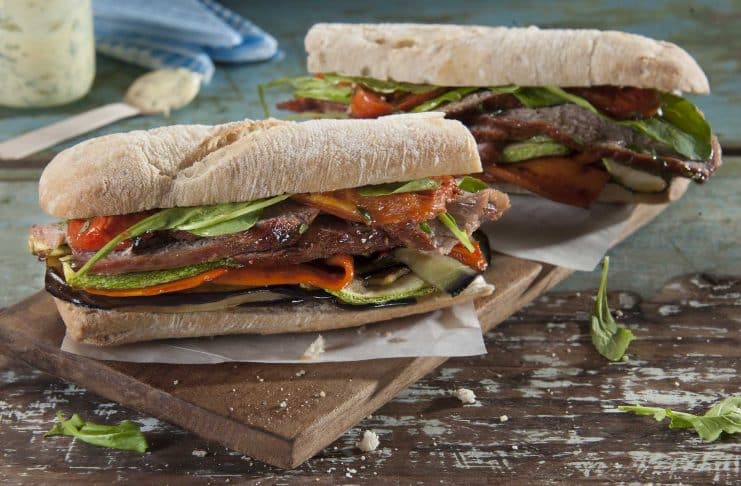 Armar los sándwiches en los panes con los vegetales grillados, los tomates asados, la carne cortada en fetas, la rúcula y la mayonesa de hierbas.