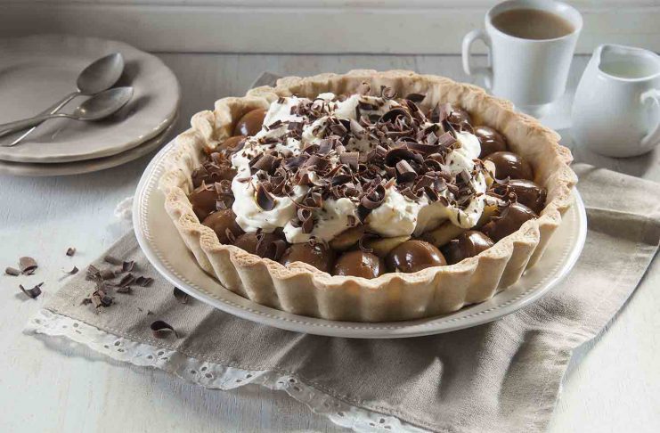 Estirar la masa en forma circular y forrar un molde de tarta desmontable de 26 cm de diรกmetro. Pinchar el interior con un tenedor y enfriar por unos 15 minutos mรกs.
