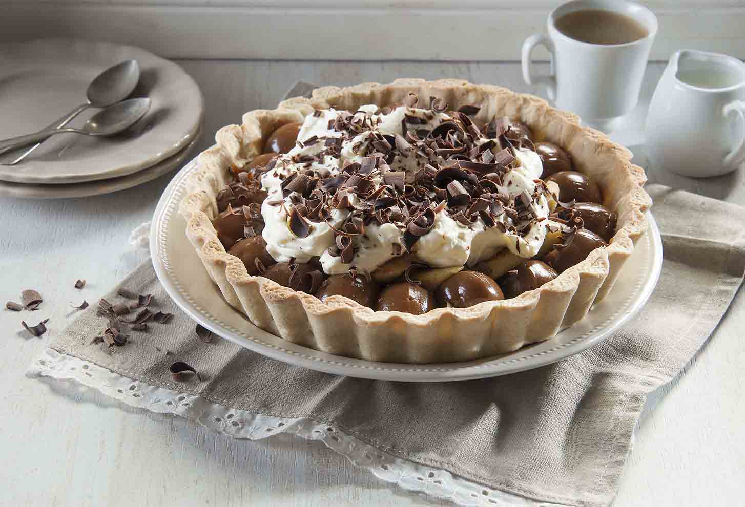 Esparcir el dulce de leche sobre la tarta. Colocar por encima las bananas doradas y la crema batida con el azúcar.
