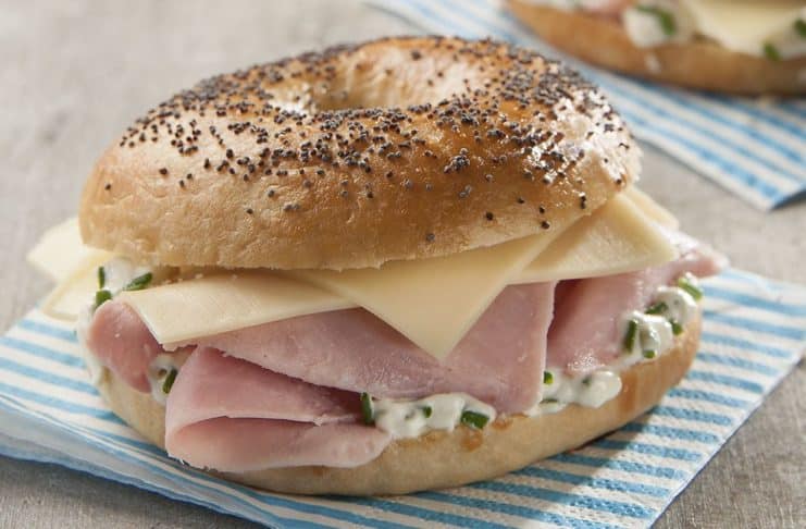 Cortar los bagels a la mitad, untar con el aderezo y rellenar con el jamón y el queso.