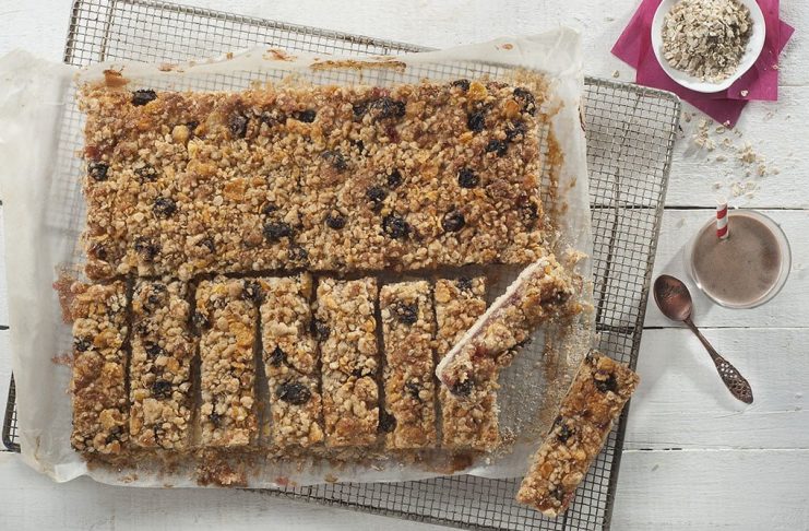 Para la cubierta: Procesar la manteca frรญa cortada en cubos con el azรบcar, la harina y la avena hasta formar un arenado. Mezclar con los copos de maรญz, las pasas y la miel.