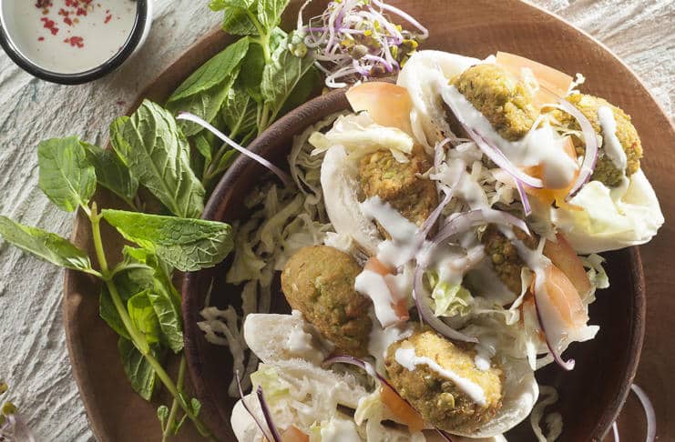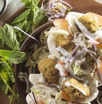 Para servir: Cortar los panes al medio, llenar con lechuga cortada en juliana fina, el pepino, el tomate cortado, los falafeles y la cebolla en pluma fina. Terminar con la salsa de yogur y servir.
