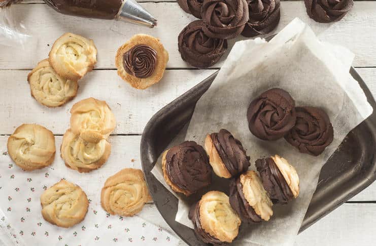 Unir dos galletitas, una de cada sabor, con el relleno de chocolate.