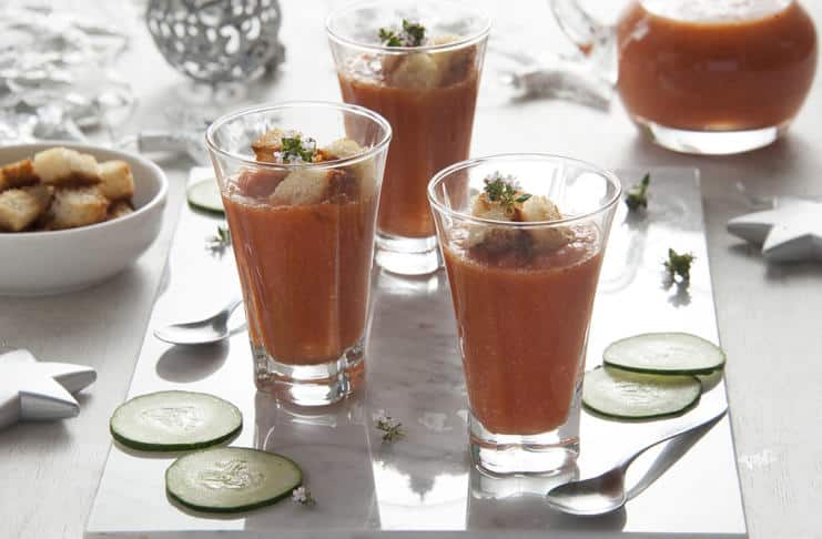 Poner en el vaso de una licuadora los tomates, el pepino, la manzana, el morrรณn, la cebolla y el ajo. Licuar.