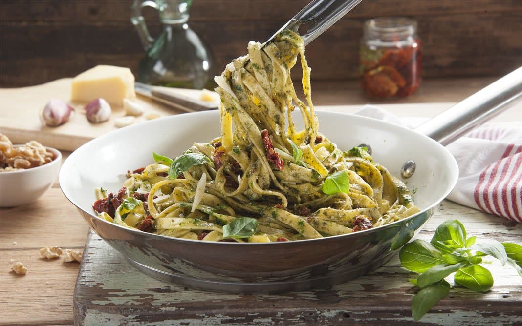 ¡Ya estamos en el mes de los enamorados!, así que vamos con plato principal y postre, para que puedan agasajar a quien quieran. Les dejo una receta que a mí me encanta: un pescado frito con papas y salsa brava. ¿Lo hacen y después me cuentan? Y para los vegetarianos, una receta de pasta casera con pesto especial de albahaca y tomates secos. Con el postre yo creo que no me equivoqué… Torre de panqueques y dulce de leche, ¿qué dicen? Todavía no conocí a nadie que me diga que no le gusta, así que a disfrutar. ¡Feliz Día de San Valentín!