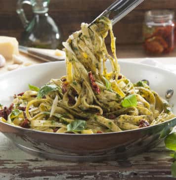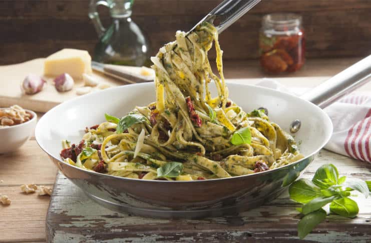 Hervir los tallarines en abundante agua con sal, colar y mezclar con el pesto.