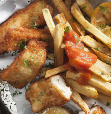 Pelar las papas y cortar en bastones. Freír las papas y el pescado en abundante aceite caliente. Escurrir sobre papel absorbente.