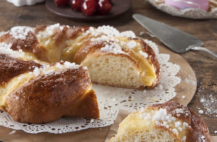 Pintar las roscas con huevo batido, espolvorear con azúcar grana y hornear a 180º de 20 a 30 minutos. Retirar y pintar con mermelada reducida o almíbar.