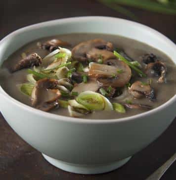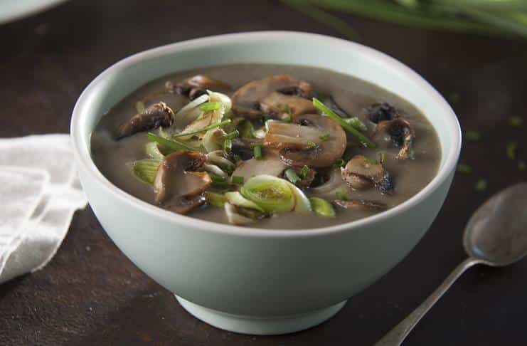 Calentar una olla mediana, poner un poco de aceite y comenzar a dorar la cebolla, el puerro y el diente de ajo cortado al medio. Cocinar 2 minutos, incorporar los hongos y dejar dorar.