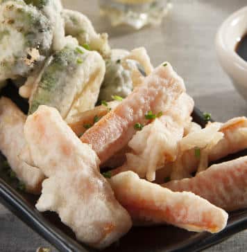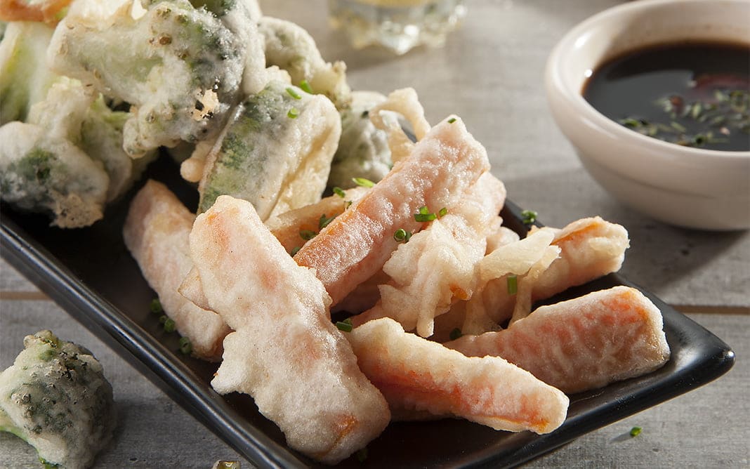 Pasar las verduras por la masa de tempura, escurrir el excedente y freír en aceite a 170°.