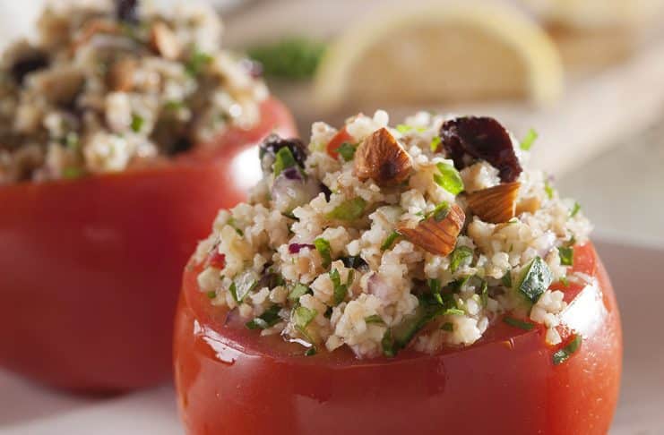 Mezclar en un recipiente el trigo hidratado con la cebolla picada, la pulpa de los tomates en trocitos, el jugo de limรณn, las pasas, las almendras picadas y el perejil tambiรฉn picado. Condimentar con sal y pimienta.