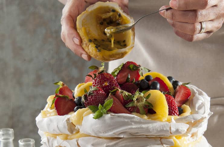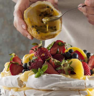 Armar la torta intercalando los discos de merengue con el curd de limón y las frutas cortadas. Terminar con las frutas arriba.