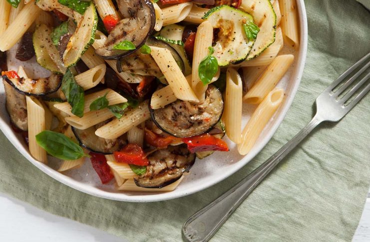 Saltear la pasta con todos los vegetales, las aceitunas, aceite de oliva, sal, pimenta y las hojas de albahaca. Servir tibia o fría.