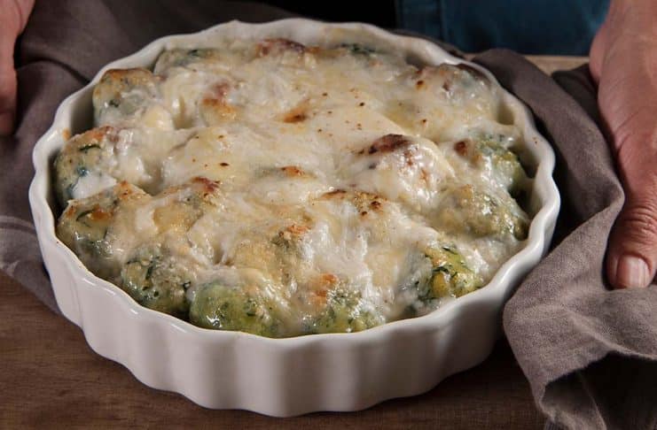 Poner un poco de la salsa en la base de una fuente para horno, colocar los malfattis cocidos y cubrir con mรกs salsa. Espolvorear con el queso reservado y llevar al horno hasta gratinar.