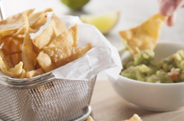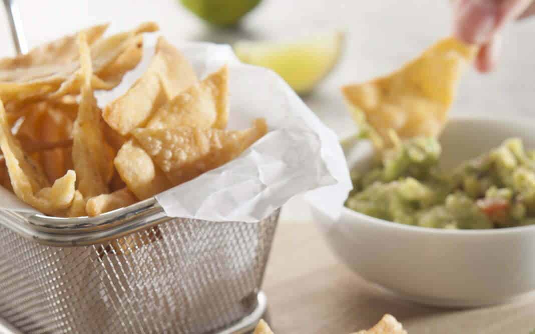 Servir los nachos en un bol o bandeja grande, con el guacamole.