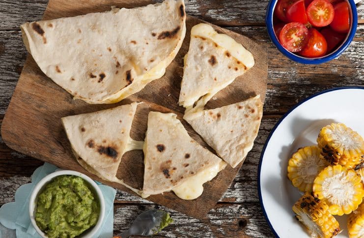 Retirar, cortar en triรกngulos y servir con los tomates, los choclos blanqueados y cortados en rodajas, y el guacamole.