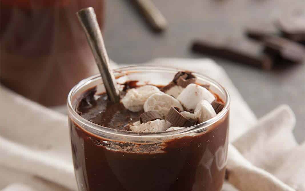 Pincelar los vasos con salsa de chocolate y volcar nuestro chocolate caliente y poner arriba 2 o 3 marshmallows cortados o marshmallows mini para que se vayan fundiendo. Terminar con chocolate rallado.