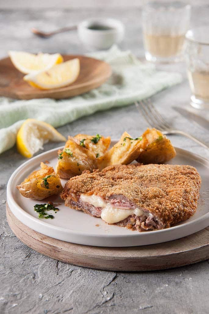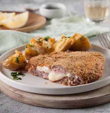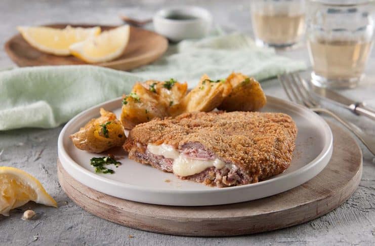 Colocar sobre cuatro bifes una feta de jamรณn y envolver un rectรกngulo no muy grueso de mozzarella. Tapar con otra carne y presionar bien, o aplastar con martillo por los bordes para sellar bien.