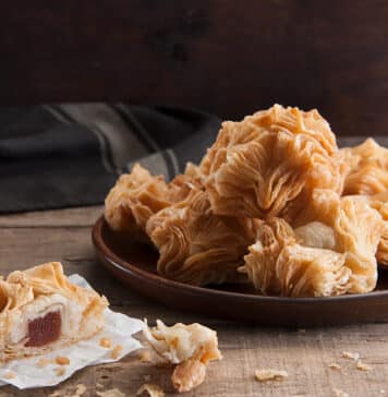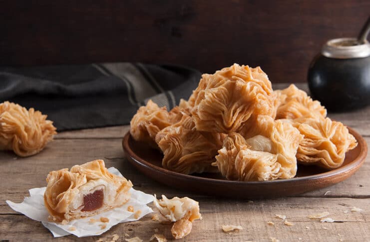 Estirar la masa de 3 mm de espesor. Cortar cuadrados de 6 cm de lado. Poner un trocito de dulce en el centro de un cuadrado, humedecer los bordes con agua y encimar otro cuadrado. Presionar alrededor del dulce y levantar las puntas empujรกndolas desde abajo, para que no se arruine el hojaldrado.