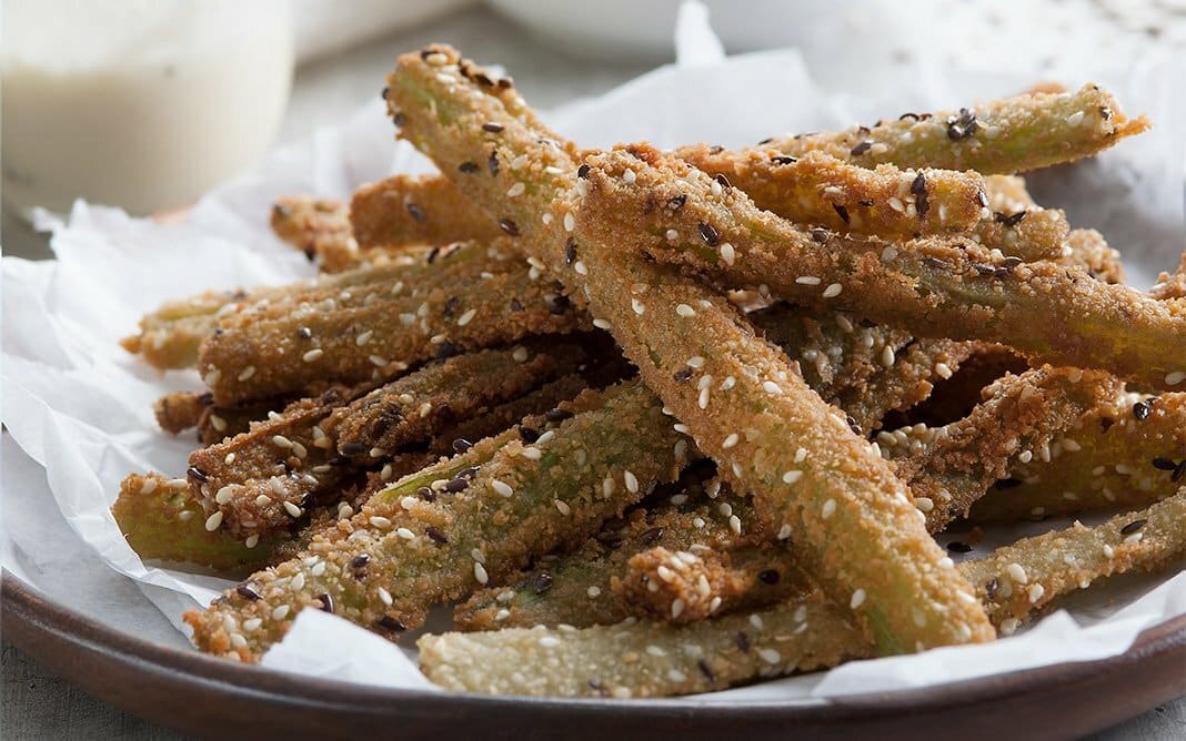 Pasar primero las pencas por la mezcla de huevos y por el rebozado. Enfriar, preferentemente, y luego freír en abundante aceite caliente y escurrir en papel absorbente.