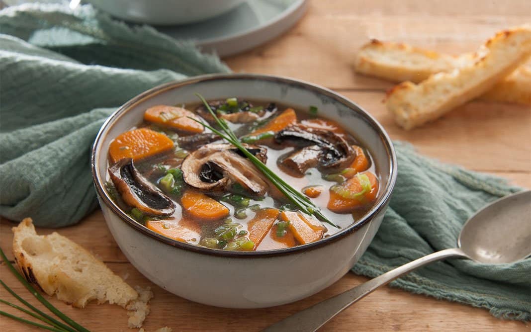 Servir la sopa caliente, y terminar con los vegetales dorados, perejil o ciboulette picado.
