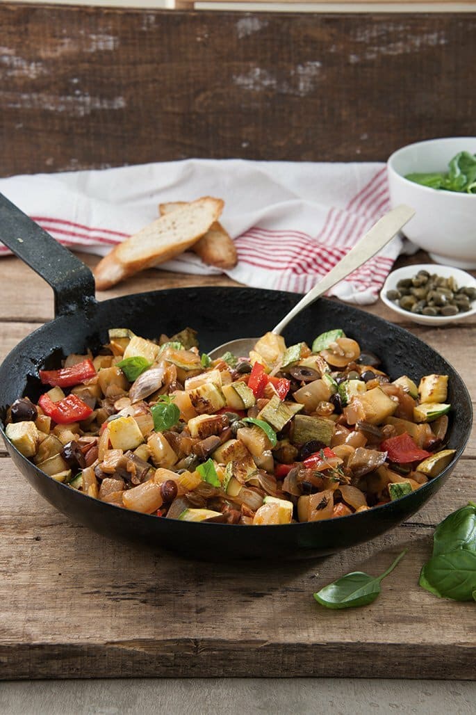 Por último, saltear la cebolla otros 5 minutos, aumentar el fuego y poner los tomates en cubitos. Dejar cocinar. Agregar el vinagre, el azúcar y continuar cocinando otros 5 minutos. Incorporar por último a la sartén todos los vegetales salteados, las aceitunas en trozos y las alcaparras. Mezclar bien, condimentar con sal y pimienta. Terminar con albahaca fresca.