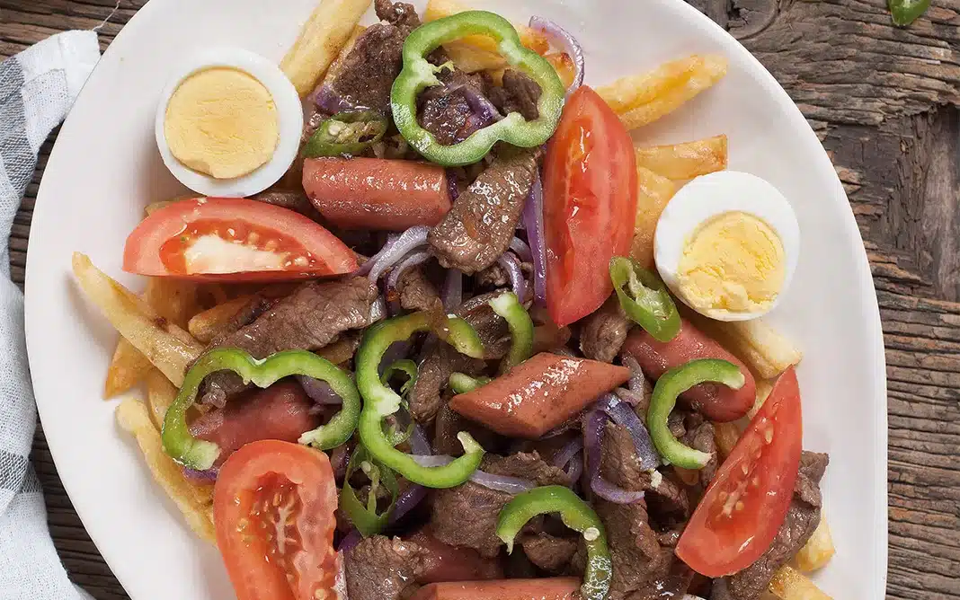 Servir en un plato o en una fuente, poniendo primero las papas fritas, luego el salteado de carne con todo su jugo. Poner arriba el tomate cortado en gajos, los huevos duros y el ají picante cortado en rodajas.